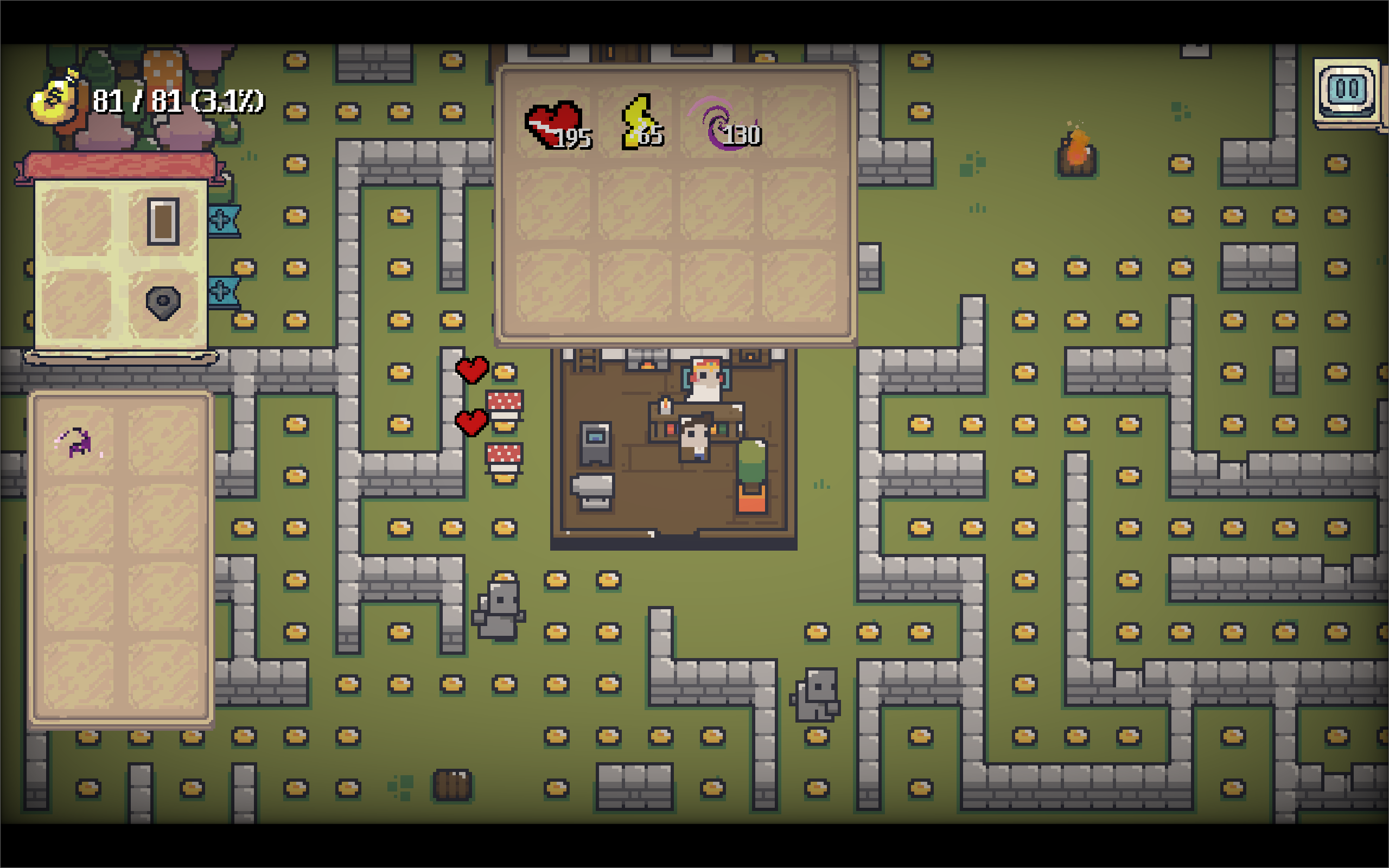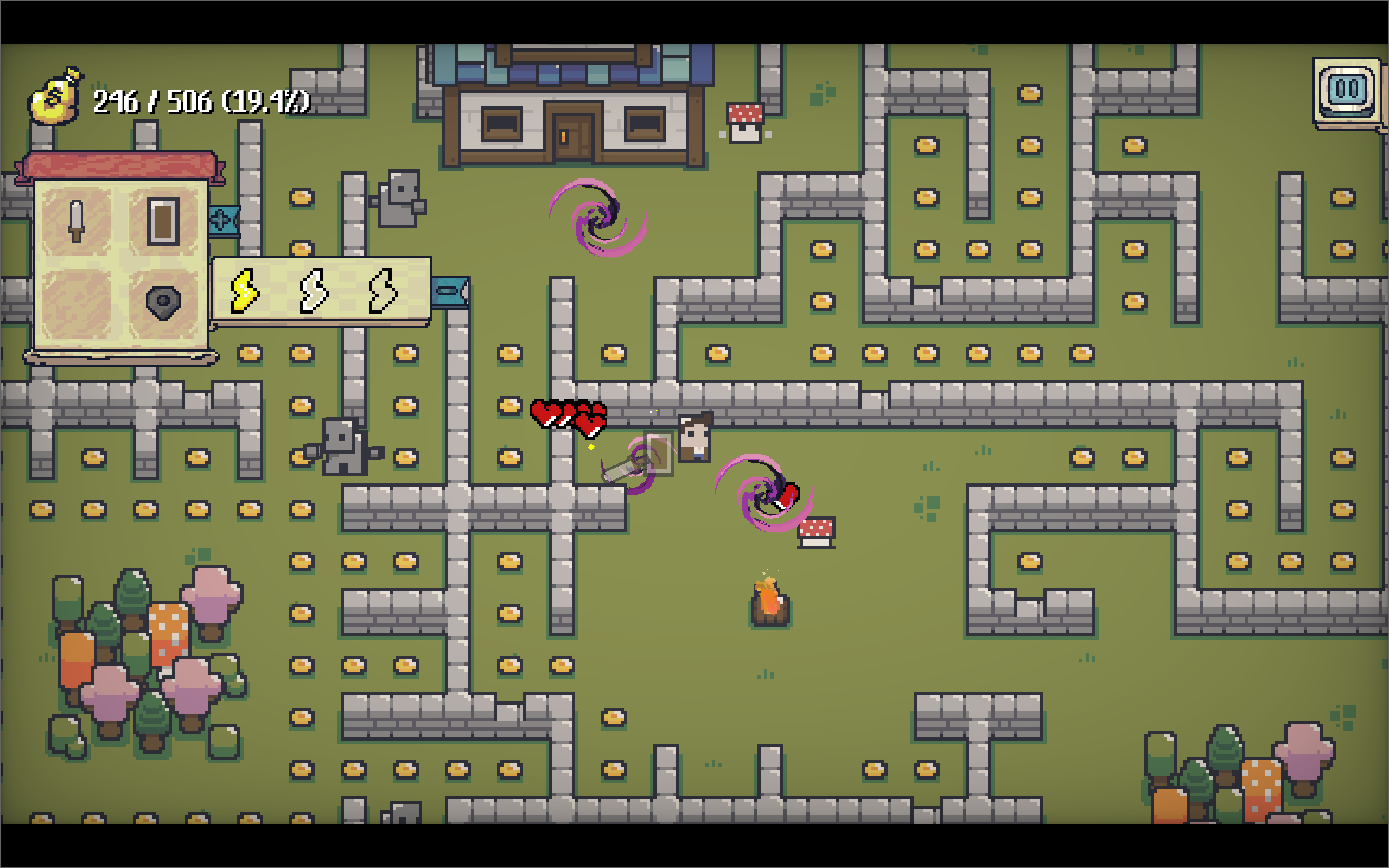 In the game, players need to collect coins, which can be used in the shop to purchase useful items, such as hearts to restore health, lightning bolts to recover stamina, and portals that allow teleportation based on the mouse position.