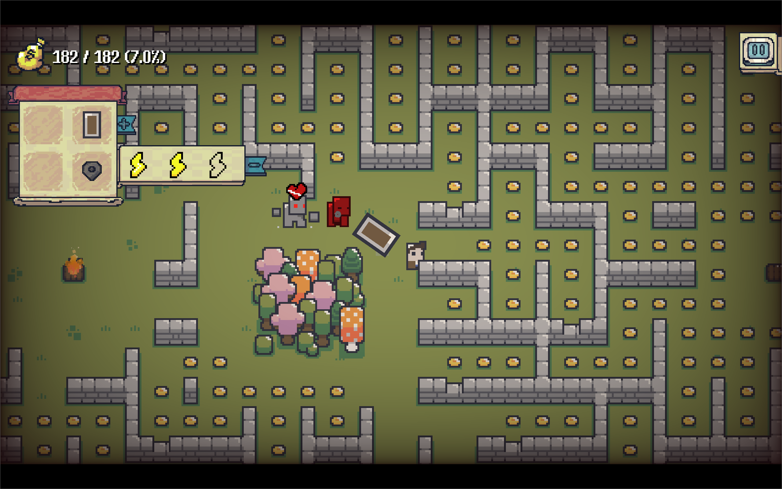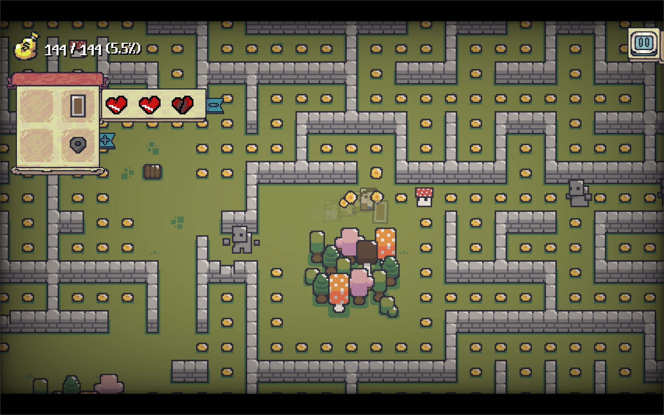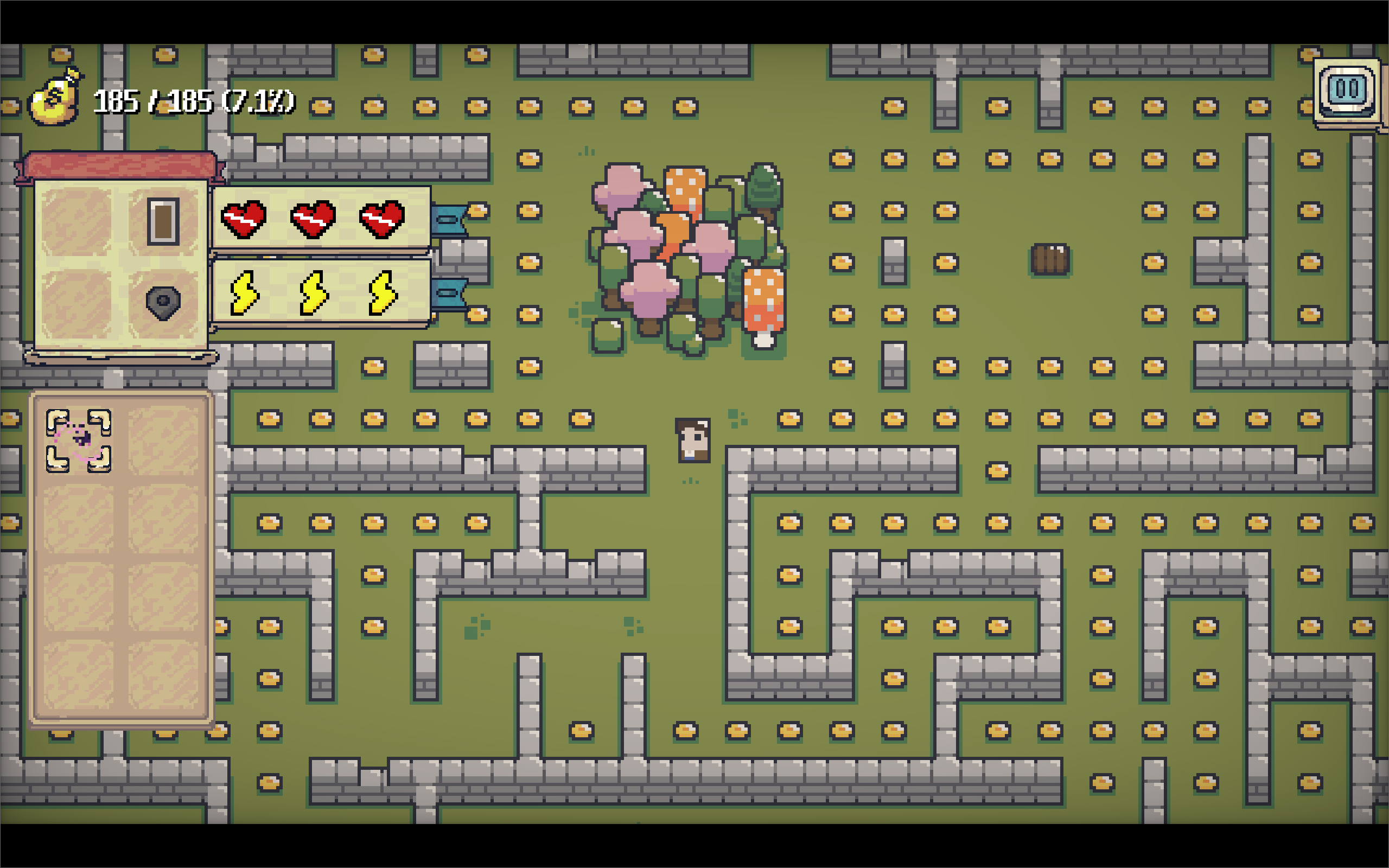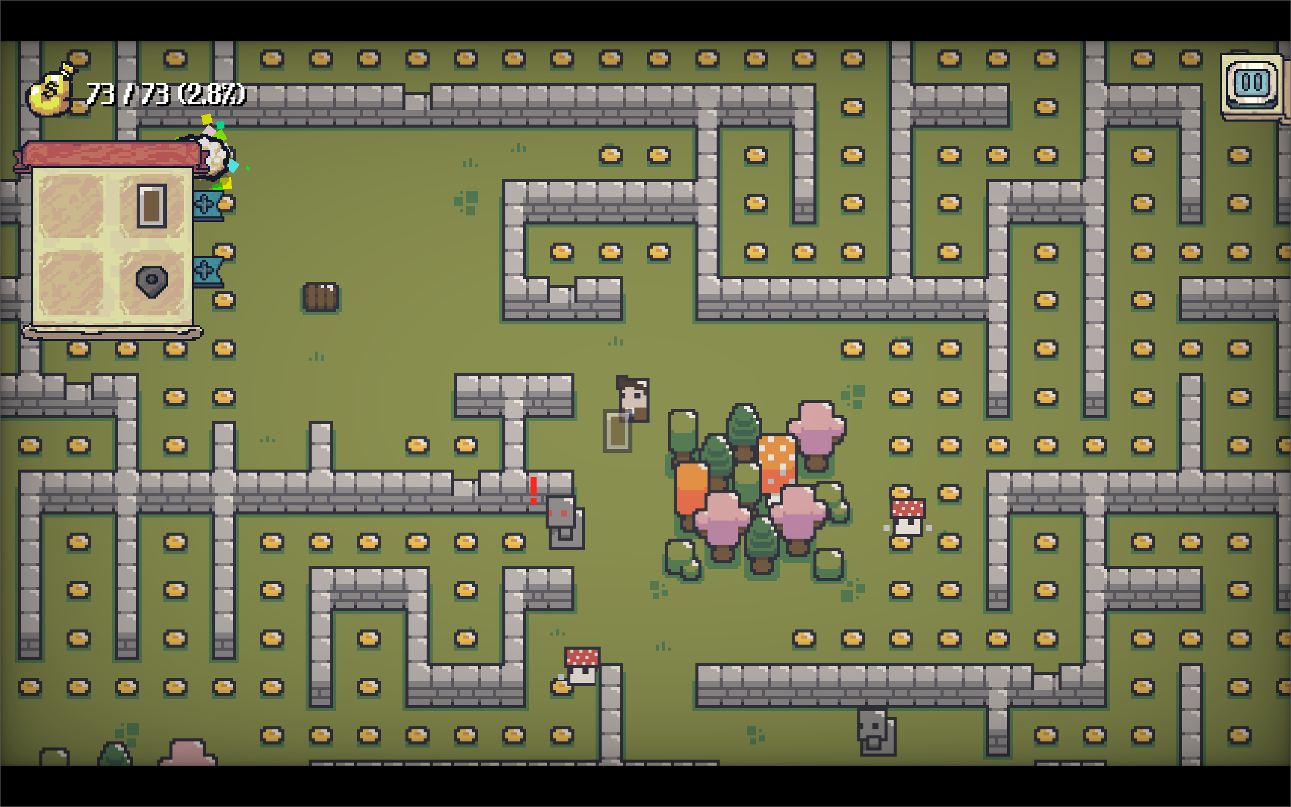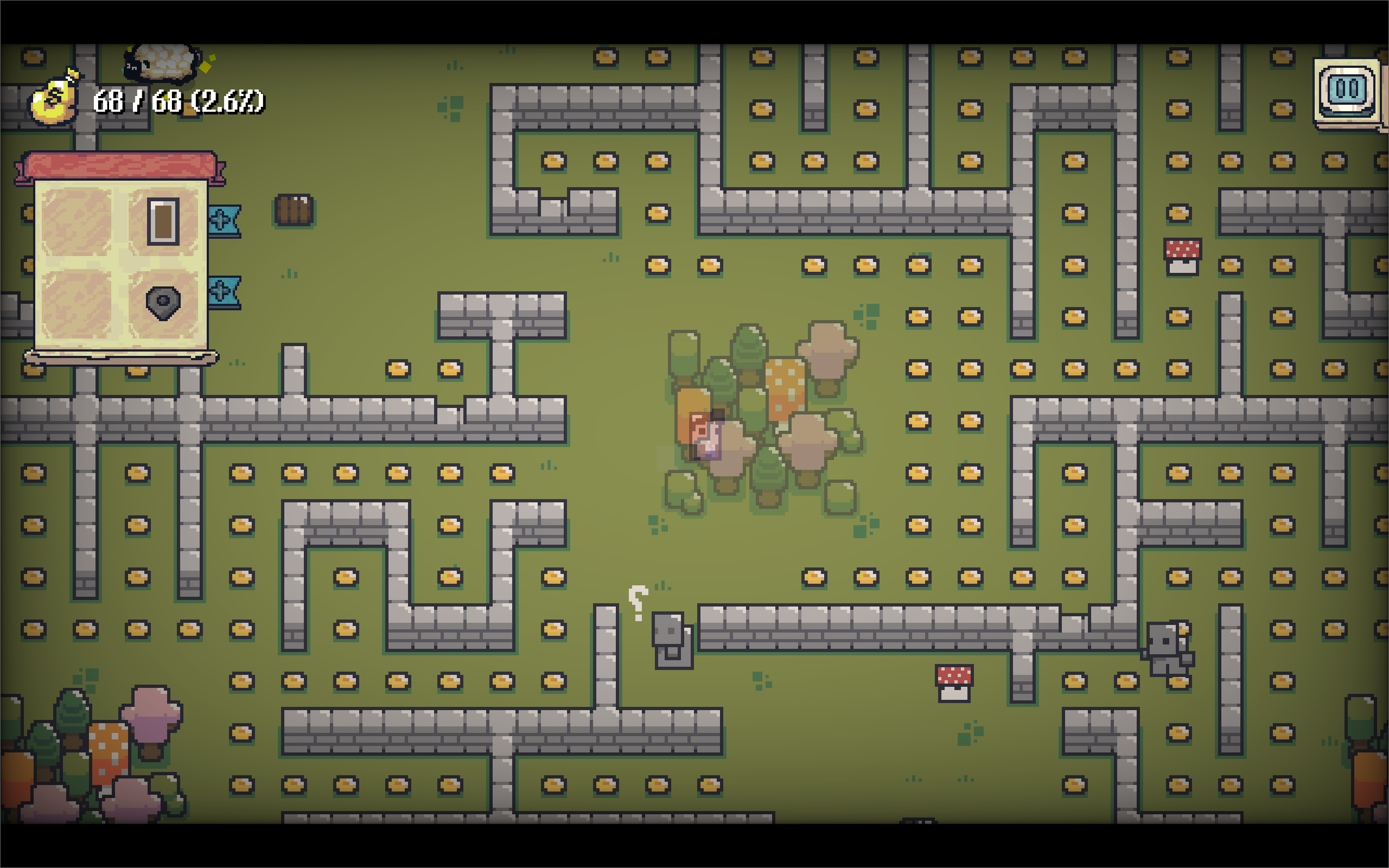 After exploring the maze for a while, players will encounter two types of enemies. One is a timid little mushroom that does nothing but blocks the player's path. The other is a golem that actively chases the player within a certain range. To escape, players can either hide in the forest to make it lose track of them or use stamina to knock it down with a shield.